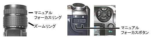 マニュアルフォーカスは、操作の違いにより下図に示す2つのタイプがあり、下図左はフォーカスリングを操作するタイプ、下図右はフォーカスボタンを操作するタイプです。 |